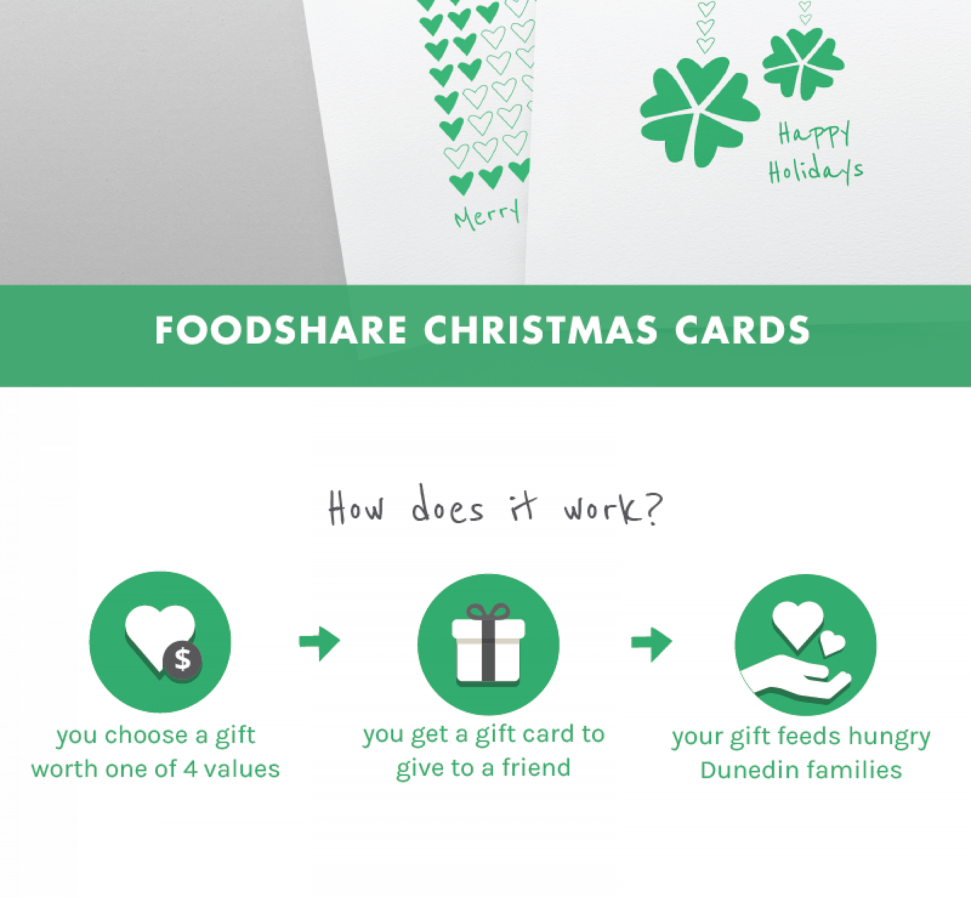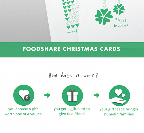 The Christmas gift cards are available in four generous donation amounts: $20.00, $50.00, $80.00 and $120.00. For every $1.00 you donate we can deliver three meals which are distributed to our many community groups. Your donation can truly make a difference this Christmas! Gift Cards can be purchased via our Facebook Shop here: http://storefrontsocial.com/mall/store/32029 alternatively you can email deborah@foodshare.org.nz to place an order.